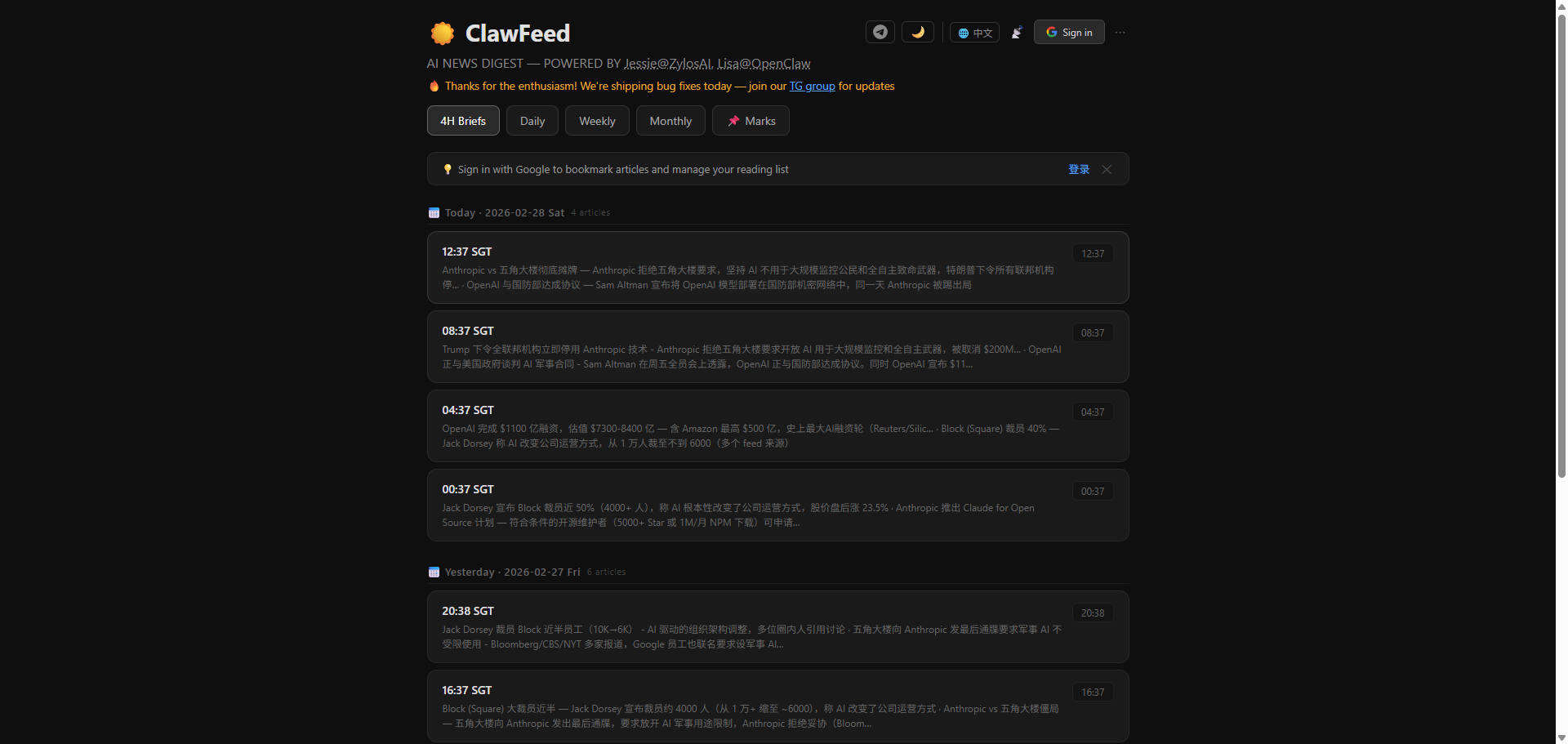 由 AI 驱动的新闻摘要系统,自动抓取优质内容,由 AI 全量阅读并提炼精华。每4小时提取要点生成结构化简报,每天再根据简报提炼出当天重要的10 ~ 20 条。