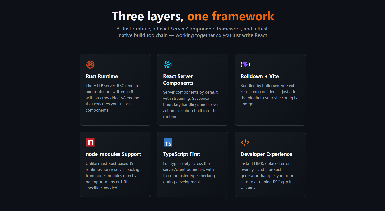 一个 Rust 驱动的超高性能 React Server Components 框架,提供与 Next.js App Router 兼容的 API,但在性能上实现了 12 倍延迟改善和 10.5 倍吞吐量提升—,适合追求极致性能的自托管应用。