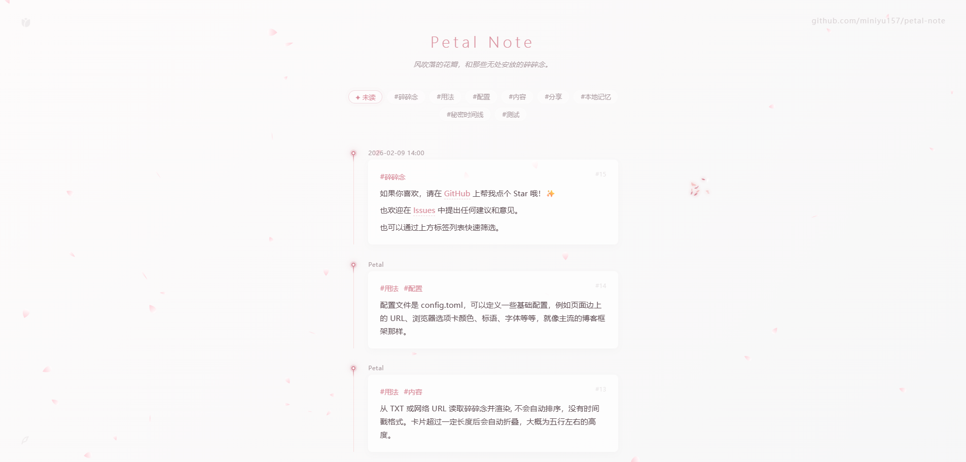 一个极简、唯美、无需任何构建工具的纯前端日记/碎碎念框架,只依赖最基本的 HTML、TXT 和 TOML 文件格式,可以把它托管到任意静态站点(如 GitHub Pages、Vercel、Cloudflare Pages)上,可作为个人日记使用。