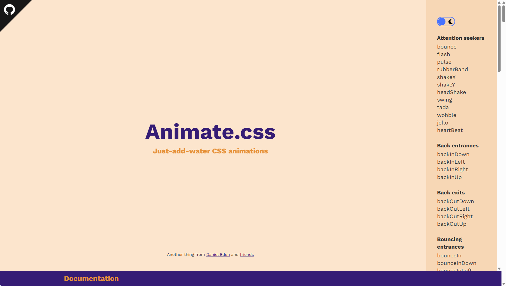 一个开源 CSS 动画库。提供大量现成的网页动画效果,例如淡入淡出、弹跳、滑动、旋转等。只需要给元素添加对应的 CSS 类名,就可以快速实现动画效果,不需要编写复杂的动画代码。