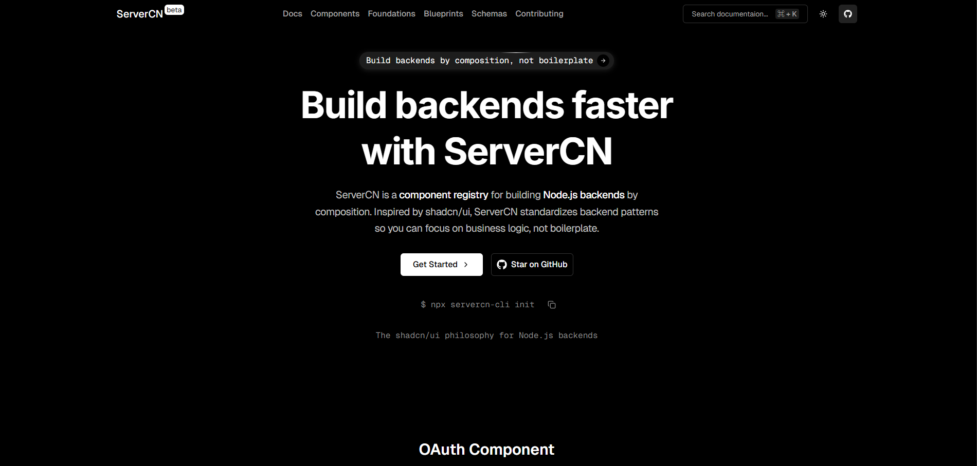 一个受 shadcn/ui 启发的 Node.js 后端组件注册库。它提供了一套可组合,可快速引入的生产级后端模块,可以像 shadcn/ui 一样,快速的集成后端中间件。包括认证、日志、错误处理、文件上传、JWT、数据库连接(MongoDB/MySQL/PostgreSQL)等模块,可以按需拉取并集成到现有项目中。