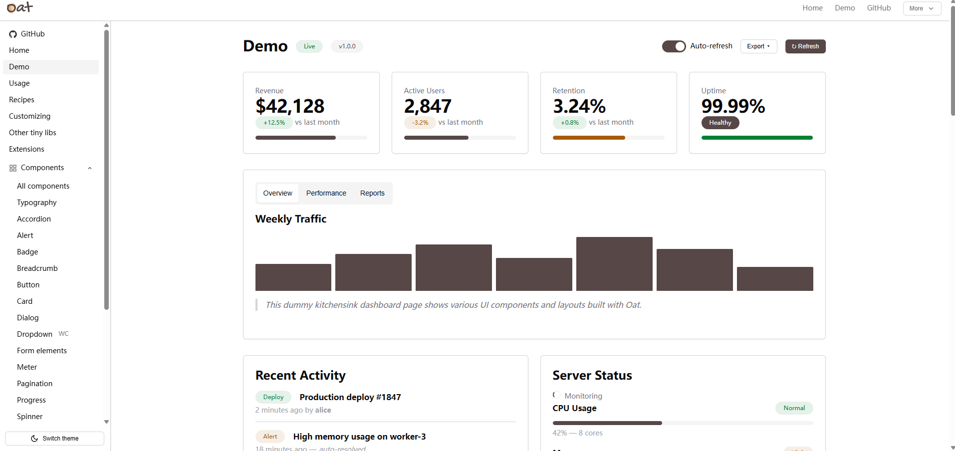 一个超轻量级、零依赖、基于语义 HTML 的 UI 组件库,只需要很小的 CSS + JavaScript(压缩 + gzip 总量约 ~8 KB),可快速构建轻量、漂亮、功能完备的网页界面。