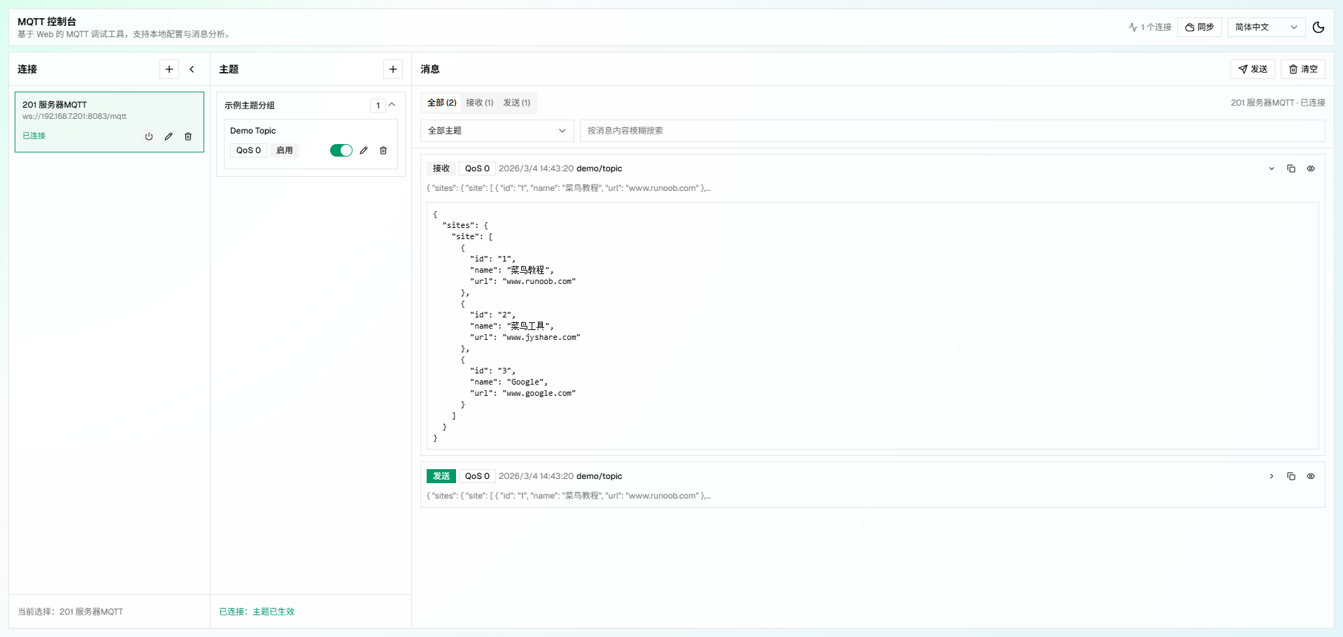 自己Vibe Coding 的一个基于 Web 的调试和测试 MQTT 消息的工具。支持连接 Broker、订阅和发布 Topic、实时查看消息,并提供本地数据存储和可选的 GitHub Gist 加密同步功能,可通过Vercel一键部署使用,支持移动端PWA应用。